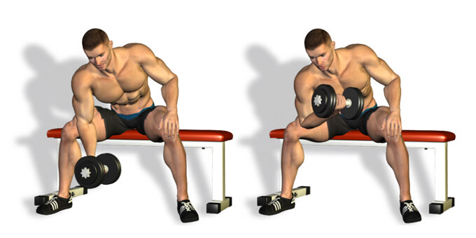 • Sit on a preacher bench and grab a dumbbell in the right arm & place it on the top of the preacher bench.