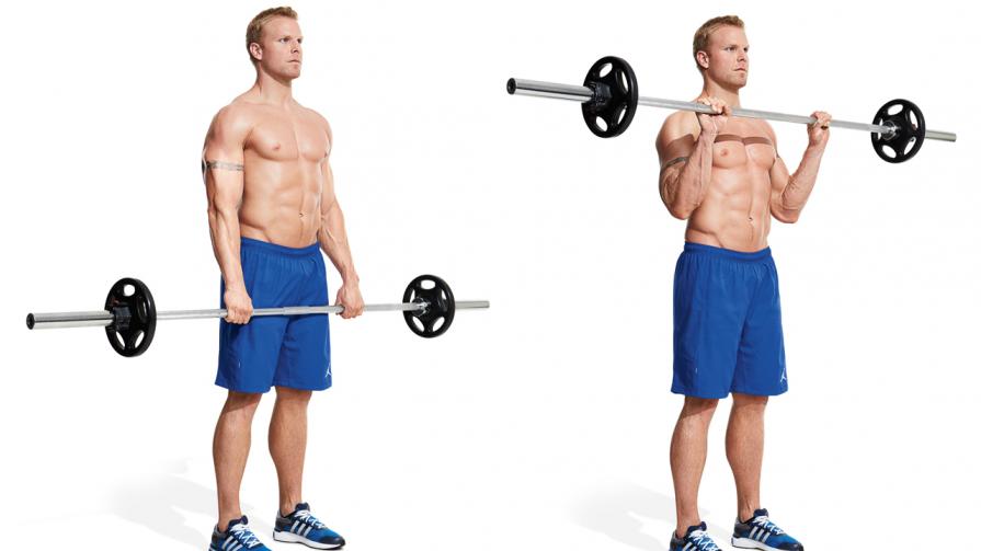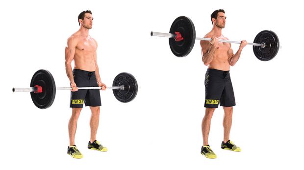 • Hold the barbell at shoulder width with your palms facing downwards and elbows close to the torso.
